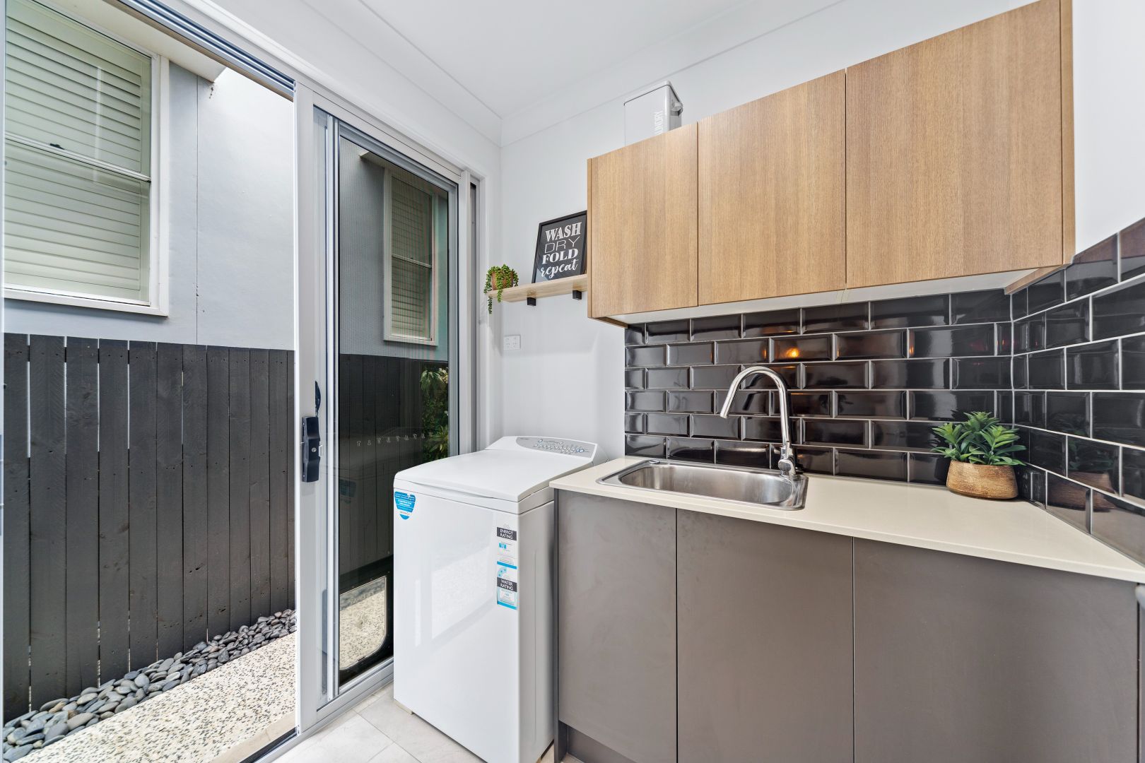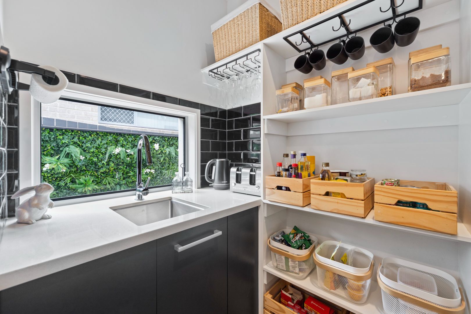 You’ll also find a practical laundry room with a laundry chute, a security screen with a pet door, a stainless, built-in laundry sink with a pull-out sink mixer and plenty of storage space.