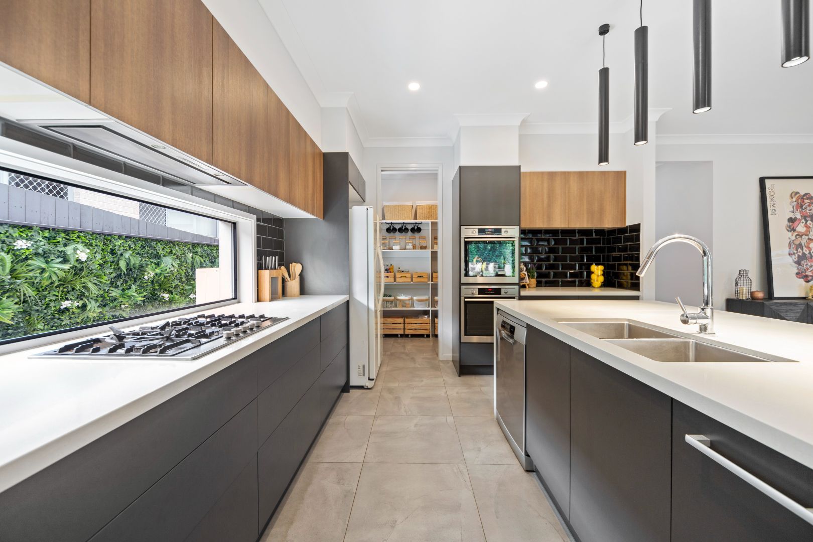– Kitchen with beautiful 40mm Quantum Quartz bench tops, AEG gas cooktop, two AEG wall ovens, with walk in butler’s pantry & breakfast bar